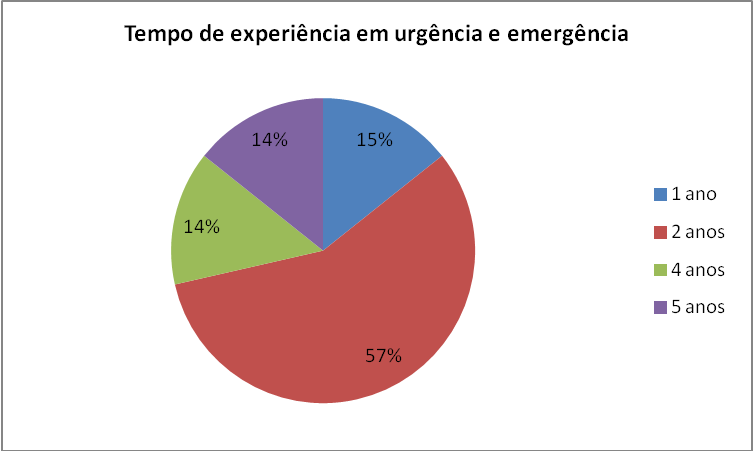 A experiência em urgência e emergência variou de um a cinco anos, no qual a maioria possua mais de 2 anos (57%), seguindo de mais de 5 anos (15%), conforme apresentado na Figura 1.