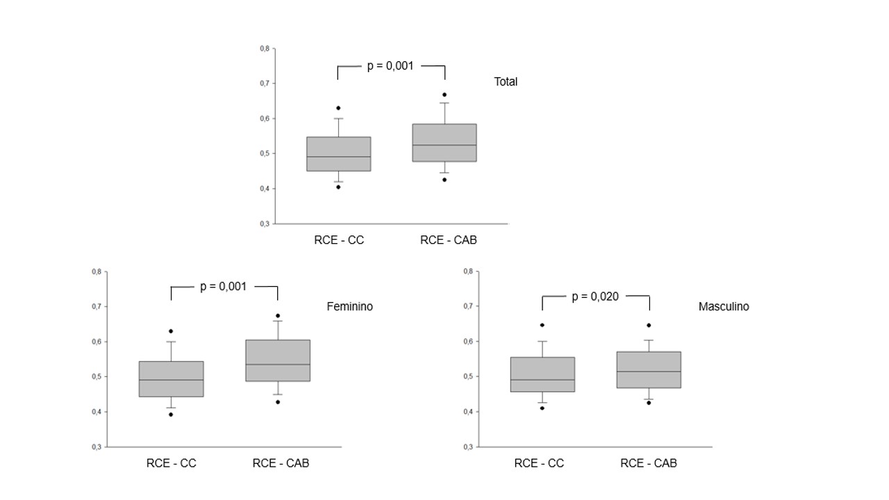 A figura 1 mostra a diferença significativa entre as duas variáveis antropométricas aferidas, CC e CAB, utilizadas para o cálculo da RCE, para o grupo composto por todos os indivíduos do presente estudo e também separado por sexo. Vale destacar que, caso fosse adotado a CAB como medida a ser utilizada na razão que estabelece o ponto de corte para a RCE, possivelmente a classificação do RCM estaria comprometida. Dessa forma, é importante que seja utilizada a CC como critério de estratificação do risco.