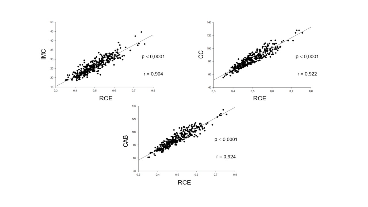 A RCE possui correlação muito forte com o índice de massa corporal, CC e CAB. Todavia, a CC e CAB não devem ser aplicados à fórmula de RCE com o mesmo objetivo. Novas pesquisas se fazem necessárias, a fim de verificar se o mesmo comportamento obtido nos resultados apresentados no presente contexto, ocorrerão em populações e comorbidades distintas.