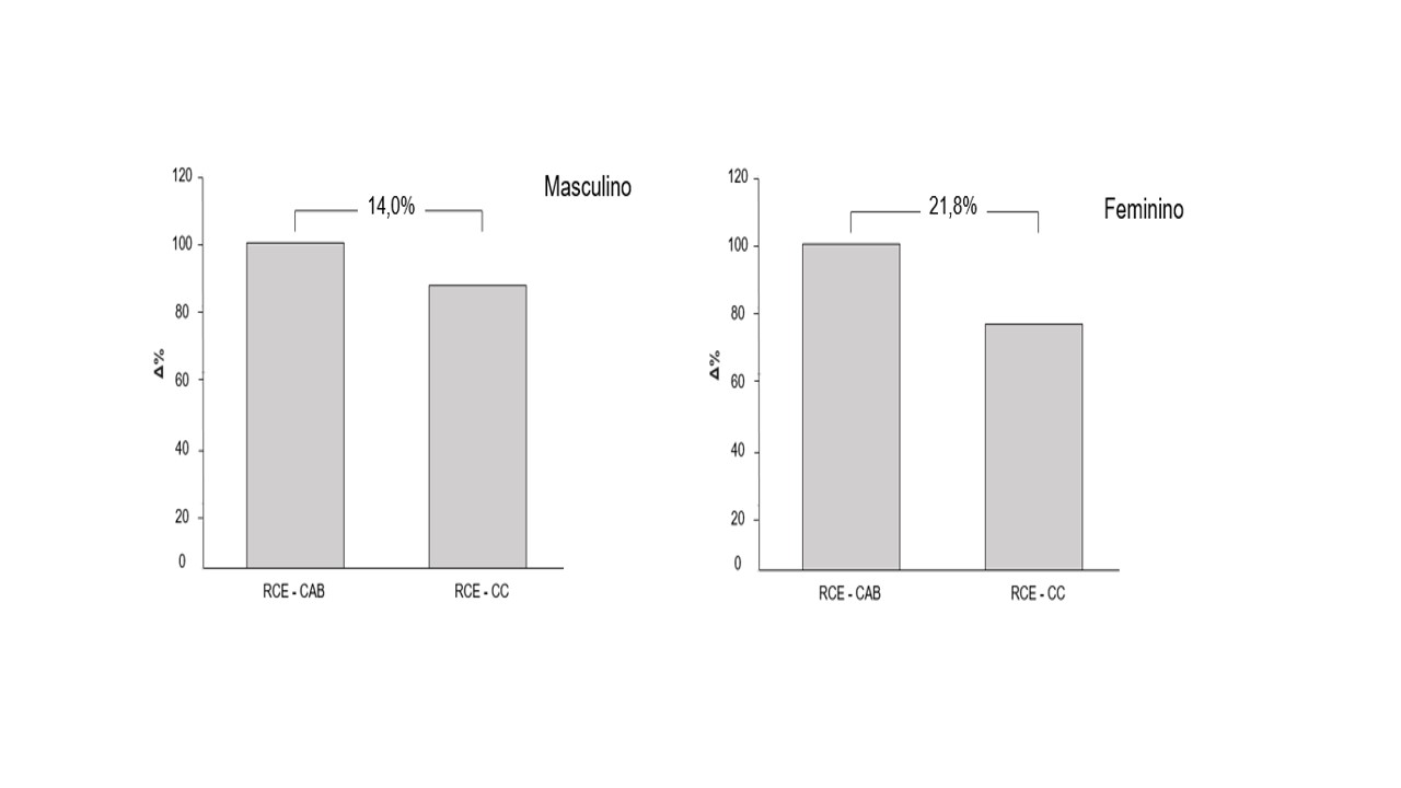 Figura 3 - Dados do delta percentual das variáveis razão cintura estatura pelo parâmetro da cintura RCE – CC e razão cintura estatura pelo parâmetro do abdômen RCE – CAB em ambos os sexos. Cálculo realizado a partir da fórmula Δ% = (nº Total de Indivíduos – nº Total de Indivíduos com Classificação Incorreta) / nº Total de Indivíduos X 100