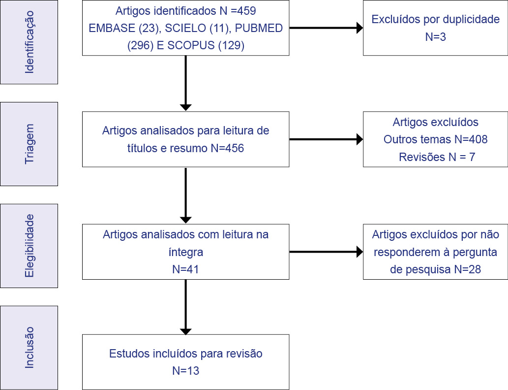 Inicialmente, foram identificados 459 artigos, sendo 23 na EMBASE, 11 na SCIELO, 296 na PUBMED, e 129 na SCOPUS. Do total de artigos encontrados, foram excluídos 446, sendo 3 duplicados. Após a leitura dos títulos e resumos, como também, da aplicação dos critérios de inclusão e exclusão pré-estabelecidos, 41 artigos foram pré-selecionados. Por fim, depois de ser efetuada a leitura na íntegra dos artigos pré-selecionados, 13 estudos foram selecionados para formar a amostra final, os quais foram majoritariamente do ano 2024, produzidos no continente asiático. O fluxograma da seleção dos estudos que foram utilizados para desenvolvimento desta revisão pode ser visualizado da figura 1.