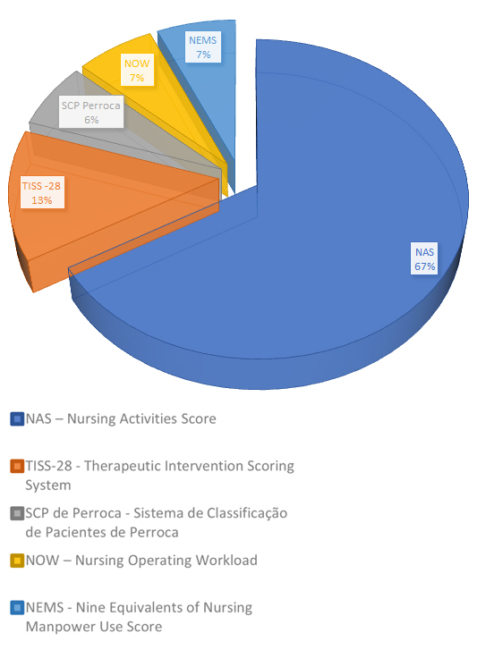 O estudo ‘Adecuación de escalas para medir cargas de trabajo mediante metodología de calidad’ [8] comparou o Nursing Activities Score (NAS) e o Nine Equivalents of Nursing Manpower Use Score (NEMS), destacando o escore NAS mais apropriado para medir a carga de trabalho de enfermagem na UTI. Outro estudo, intitulado ‘Classification of patients and nursing workload in intensive care: comparison between instruments’ [9], investigou a comparação entre o NAS e o Sistema de Classificação de Pacientes (SCP) de Perroca, oferecendo visão sobre o NAS como instrumento de medida direta mais adequado quando comparado com a medida indireta de Perroca.