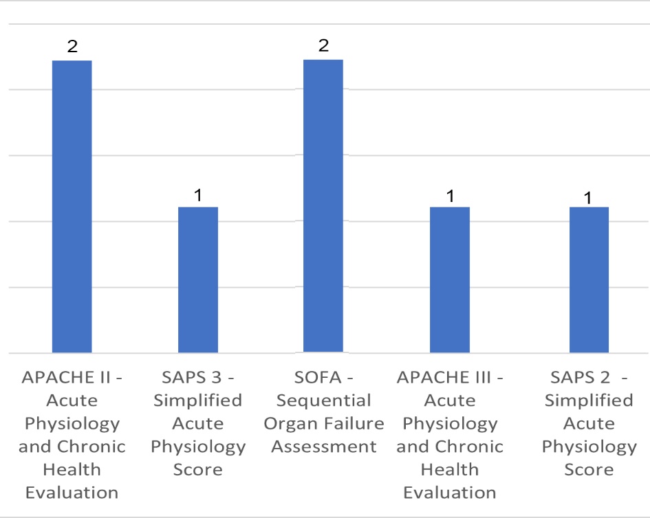 Além destes instrumentos citados, alguns estudos também aplicaram escores para avaliar a gravidade clinica dos pacientes, juntamente com os instrumentos de classificação de pacientes para o dimensionamento de enfermagem como forma alternativa de classificar os pacientes. Foram utilizados na seguinte proporção: Simplified Acute Physiology Score – SAPS [10,11], Acute Physiology and Chronic Health Evaluation - APACHE [12-14] e Sequential Organ Failure Assessment - SOFA [10,13], conforme figura 3.