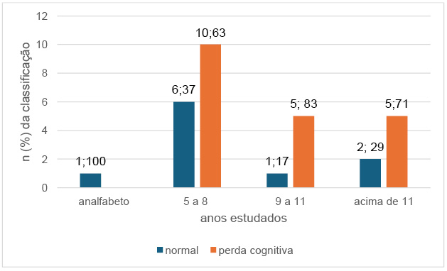 O Gráfico 1 apresenta o número e percentual de idosos com perda cognitiva conforme os anos de estudo. Observa-se que 10 (63%) dos idosos com 5 a 8 anos de estudo apresentaram perda da função cognitiva, assim como 5(83%) dos que haviam estudado de 9 a 11 anos e 5(71%) dos com mais de 11 anos de estudo.