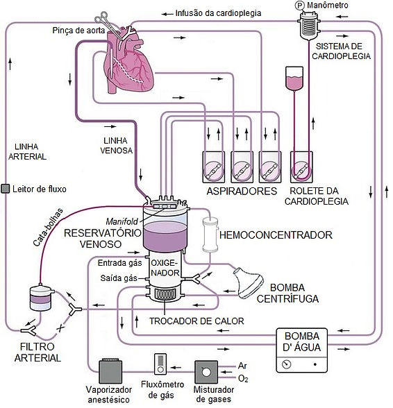 A Circulação Extracorpórea (CEC) consiste em um conjunto de equipamentos, aparelhos, máquinas e circuitos, com o objetivo de realizar a função do coração e pulmões durante uma cirurgia. É realizada através de um circuito de perfusão que inclui sistema oxigenador, reservatório venoso, oxigenador, trocador de calor, bomba arterial, ventosas de cardiotomia, filtro de linha arterial, sistemas de cardioplegia e cânulas (Figura 1).