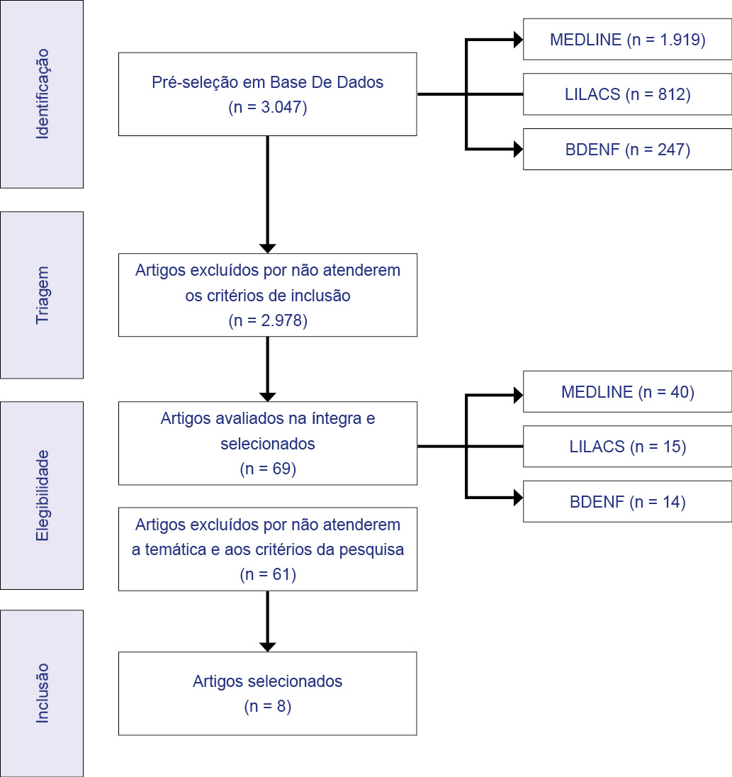 A partir da estratégia de busca, foram encontrados 3.047 estudos nas três bases de dados. Em seguida, uma pré-seleção foi realizada considerando a leitura do título, do resumo e dos descritores, que após a exclusão, seguindo os critérios definidos na presente pesquisa, totalizaram 69 artigos. Estes estudos passaram então por uma leitura integral, a fim de evidenciar e delimitar o conteúdo objeto para fins de aprofundamento da investigação [7]. Para tal, considerou-se o tema e seu enquadramento nos critérios estabelecidos. Identificadas então as amostras, obteve-se uma amostra final de 8 artigos. Os dados dessas etapas se apresentam de forma mais adequada no fluxograma (Figura 1).