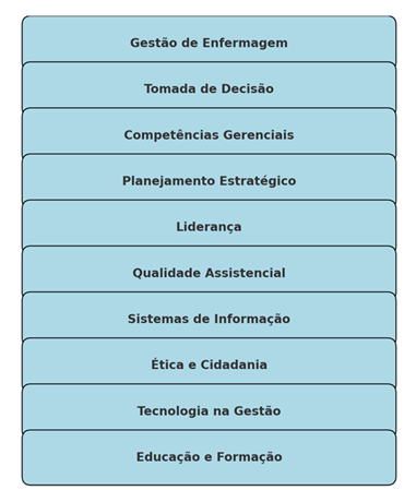 Palavras-chave: Enfermagem; Organização e Administração; Competência Profissional; Administração Hospitalar; Tomada de Decisões Gerenciais.