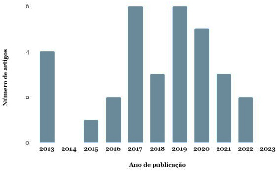 Dos 32 artigos selecionados, por cumprirem os critérios de inclusão do estudo, o mais antigo foi publicado em 2013 e o mais recente data do ano de 2022. Nota-se um aumento significativo na produção de artigos em 2017 e 2019 e ausência de achados nos anos de 2014 e 2023 (Figura 2).