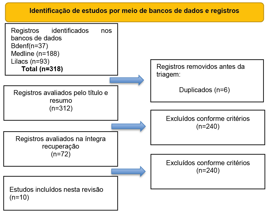 A seleção nas bases de dados identificou 318 publicações. A amostra foi composta por 10 estudos. As etapas para a seleção se encontram na Figura 1.