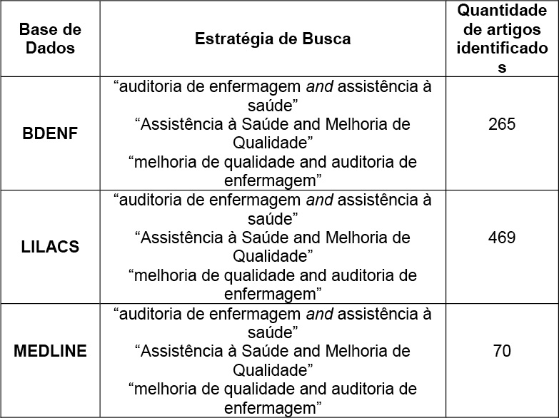 Realizou-se uma busca sistemática nas bases de dados: Base de dados de enfermagem (BDENF), Medical Literature Analysis and Retrievel system online (MEDLINE) e Literatura Latino-americana e do Caribe em Ciências da Saúde (LILACS). As publicações foram identificadas através dos Descritores em Ciências da Saúde (DeCS), a saber: “auditoria de enfermagem and assistência à saúde”, “Assistência à saúde and melhoria de qualidade”, “melhoria de qualidade and auditoria de enfermagem”. A estratégia de busca eletrônica completa está ilustrada no Quadro 1.
