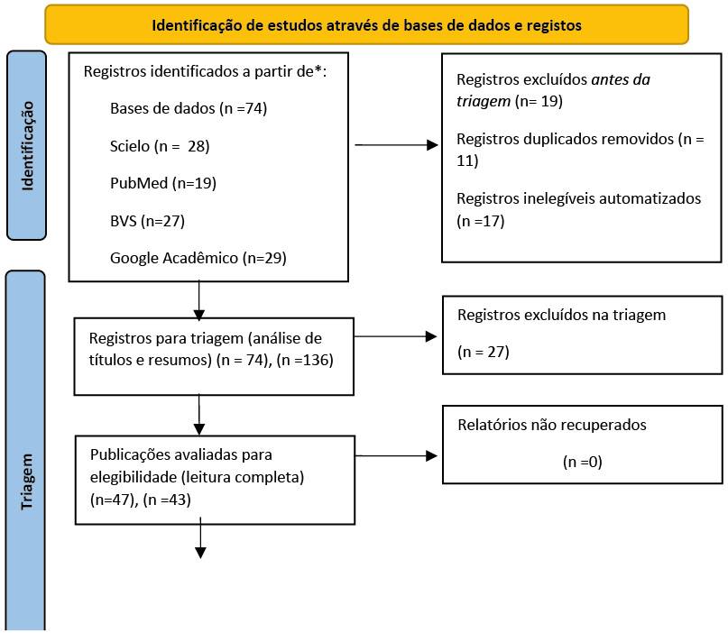 A seguir, apresenta-se o fluxograma que representa o processo de identificação, triagem, elegibilidade e inclusão dos estudos na revisão integrativa, de acordo com modelo adaptado da estratégia PRISMA: