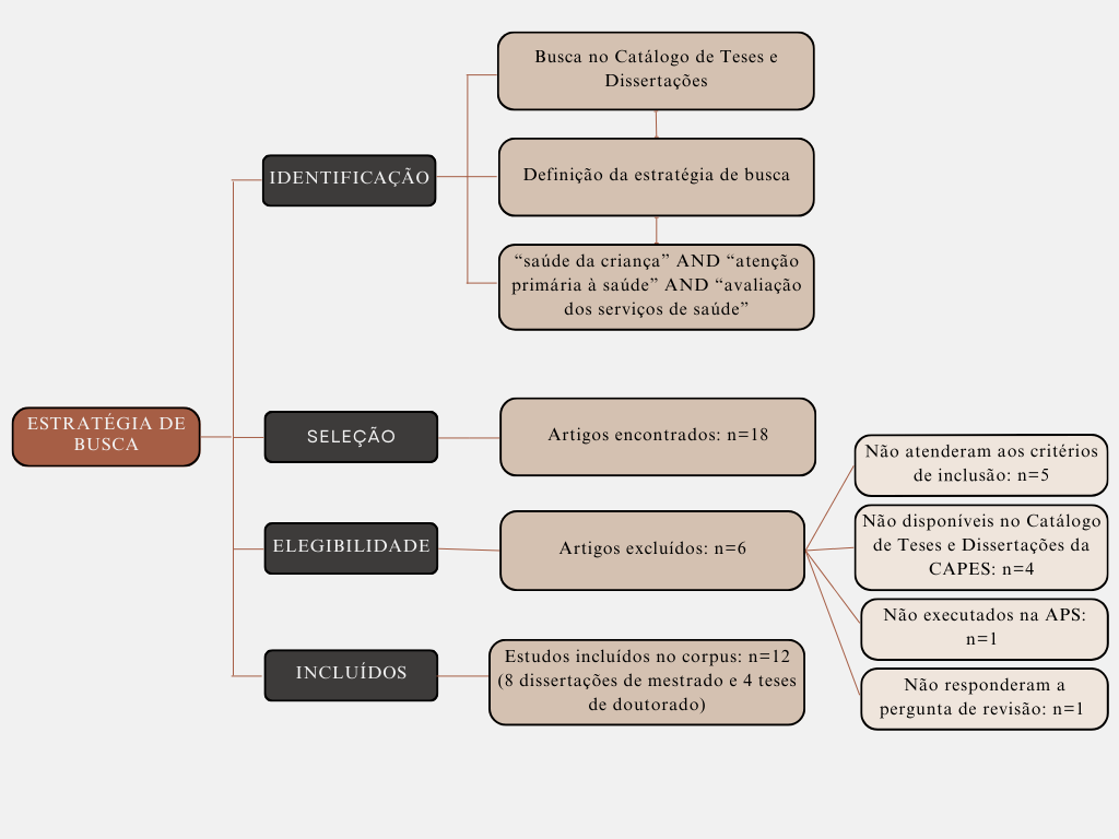 Introduction: The evaluation of child health services in Primary Health Care (PHC) is essential to ensure quality care. Objective: To describe Brazilian postgraduate scientific productions related to the evaluation of child health services in Primary Health Care. Methods: This is a bibliographic research, using a narrative literature review approach, based on a search for information in the CAPES Theses and Dissertations Catalog (Coordination for the Improvement of Higher Education Personnel). The search strategy employed the Portuguese descriptors “saúde da criança” (child health), “atenção primária à saúde” (primary health care), and “avaliação dos serviços de saúde” (health services evaluation), combined using the Boolean operator AND. The search was conducted in June 2024, with no time restriction. The inclusion criteria were: national theses and dissertations, with no restriction on the field of knowledge and without a time limit, that addressed the review question, which allowed the identification of trends in scientific production on the topic. Exclusion criteria included: studies not available in the CAPES Theses and Dissertations Catalog and scientific works not conducted within the scope of PHC. Results: Twelve studies were selected, including eight master’s dissertations and four doctoral theses, most of which originated from Nursing postgraduate programs. The Midwest region was the only one that did not present any studies, while the South region concentrated the majority of them. The predominant methodological approach was quantitative, and the main evaluation tool used was the Primary Care Assessment Tool (PCAT). Conclusion: The quality of child health care in Primary Health Care remains below ideal standards, indicating the need to improve the services offered in PHC, including the strengthening of the child care network and the qualification of health professionals.