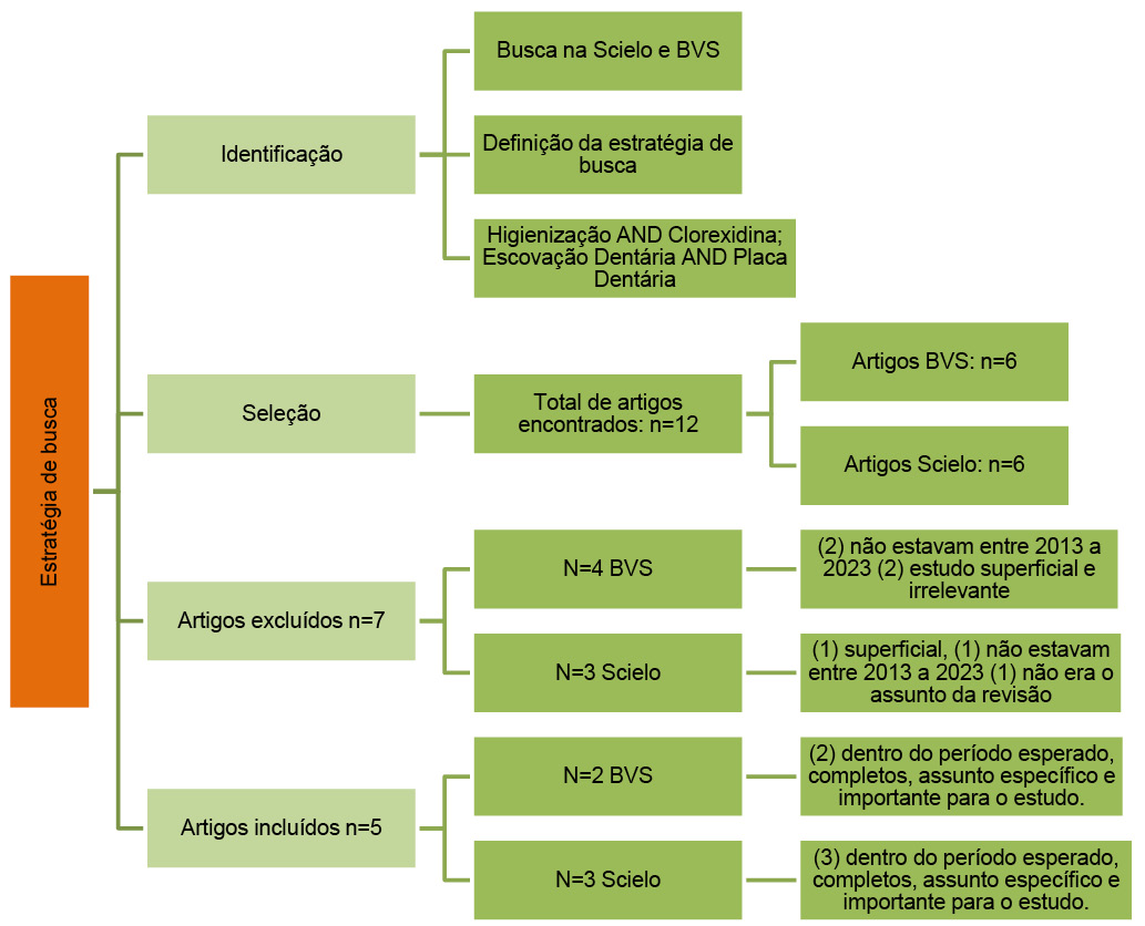 No primeiro momento foram identificados 12 artigos no total. Desses, apenas 5 foram incluídos no estudo por atenderem aos critérios de inclusão, ou seja, apresentavam relevância científica, conteúdo completo, assunto específico relacionado ao tema da pesquisa e estavam dentro do período dos últimos 10 anos. Os 7 artigos restantes foram excluídos por não atenderem a esses critérios, enquadrando-se nos critérios de exclusão, como estudos irrelevantes, superficiais ou fora do período estabelecido. A estratégia de busca utilizada está representada no Fluxograma 1.