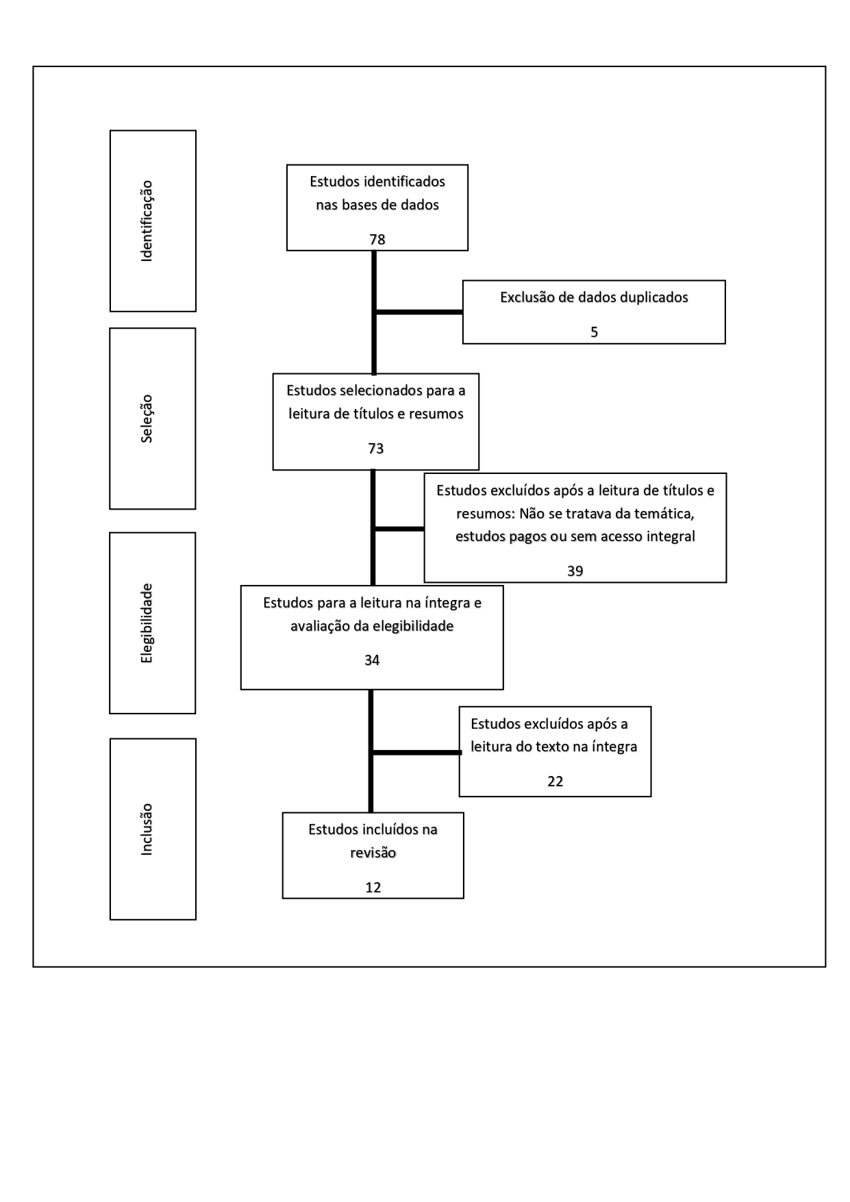 A partir da seleção de dados, foram obtidos 78 artigos, destes 5 eram duplicados e foram excluídos. Dessa forma, dos 73 restantes, 39 foram excluídos após a leitura dos títulos e resumos, por não se tratarem da temática, eram pagos ou não eram disponibilizados na íntegra. Dentre os 34 elegidos para a leitura na íntegra, excluiu-se 22 estudos e foram inseridos 12 artigos nesta revisão.
