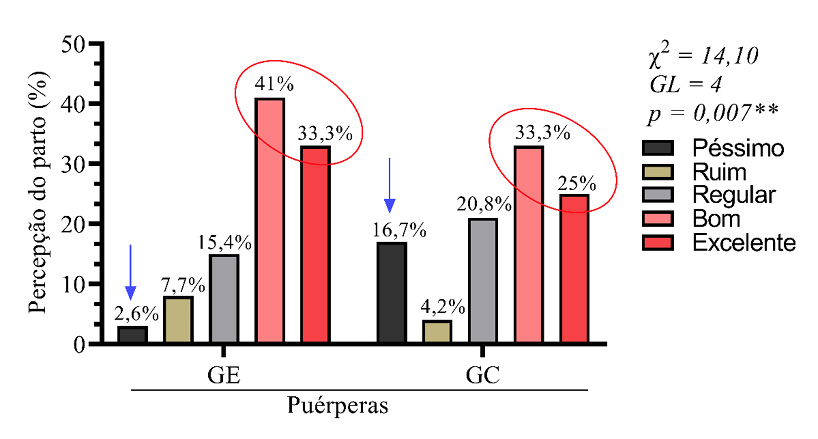 Respostas significativas foram observadas (p < 0,05), tendo em vista que no GE mais de 70% das puérperas consideraram o parto Bom ou Excelente. Já no GC, essa percepção foi de aproximadamente 55%. Outra variação considerada, e a mais significativa para a pesquisa, foi na percepção de parto Péssimo, considerado por 2,6% das pacientes do GE e por 16,7% das pacientes do GC, indicando que o GE forneceu melhor percepção de parto às puérperas avaliadas (figura III).