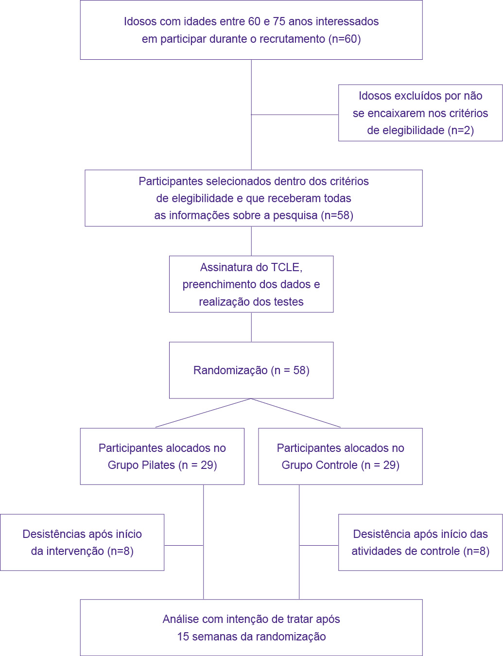 A amostra foi composta por 58 idosos de ambos os sexos, divididos aleatoriamente em Grupo Pilates (n = 29) e Grupo Controle (n = 29). O tamanho amostral foi determinado mediante ao cálculo amostral realizado no programa Gpower, versão 3.1, utilizando-se do tamanho de efeito de f = 0,25 0 (médio), tomando como referência o estudo de Oliveira et al. [17], poder de 80% e nível de significância de 5%. O cálculo amostral resultou num total de 58 participantes divididos igualmente em dois grupos.