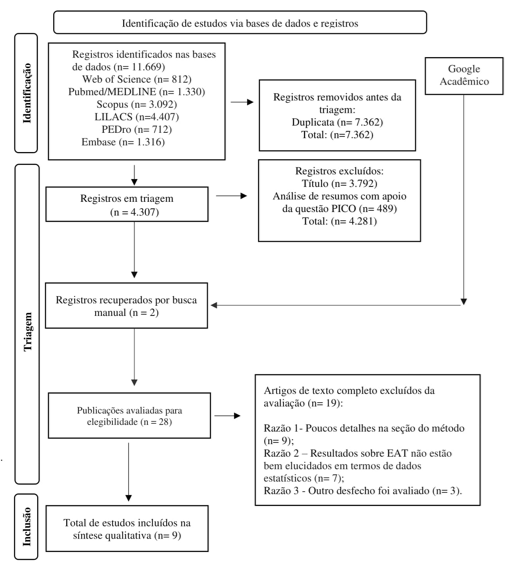 Nas bases de dados selecionadas para a busca de artigos, foram identificados 11.669 artigos. Após a retirada de 7.362 artigos duplicados, restaram 4.307 artigos para análise. Na primeira etapa da triagem houve uma análise abrangente de títulos e resumos eliminandos 4.281 artigos, permaneceram 26 artigos científicos. Posteriormente, houve uma recuperação de 2 estudos por busca manual e pela literatura cinzenda no Google Acadêmico. Assim, restaram 28 artigos elegíveis para leitura na íntegra, sendo que 19 foram excluídos da análise devido aos seguintes fatores: nove apresentaram poucos detalhes na seção de métodos, 7 não apresentaram resultados sobre EAT bem elucidados em termos de dados estatísticos e três avaliaram outros desfechos não compatíveis ao propósito do presente estudo. Já na etapa de inclusão restaram 9 estudos científicos, com maiores detalhes na Figura 1.