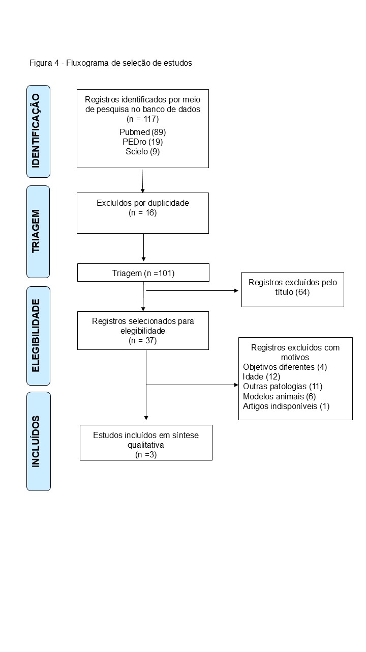 As buscas foram realizadas nas bases de dados PubMed, PEDro e SciELO, totalizando 117 artigos encontrados. No PubMed, foram identificados 89 artigos, dos quais três atenderam aos critérios de elegibilidade e foram selecionados para o estudo. A busca na base SciELO retornou nove artigos, porém nenhum deles atendeu aos critérios estabelecidos. Na base PEDro, foram encontrados 19 artigos, sendo que três cumpriam os critérios de inclusão, mas foram excluídos devido à duplicidade.