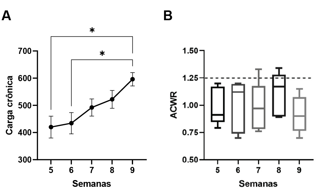 Em relação à carga crônica, observou-se um aumento significativo na 9ª semana em comparação com as 5ª e 6ª semanas (Fig. 1A). Entretanto, a relação carga de trabalho aguda:crônica (ACWR) não apresentou variações significativas ao longo do período (Fig. 1B). Vale ressaltar que os valores da ACWR permaneceram abaixo do limiar associado a um maior risco de injúria (aproximadamente 1,25).