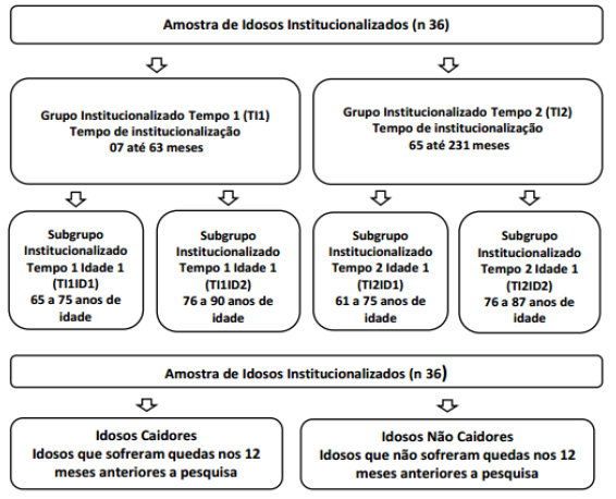 Para a seleção da amostra, inicialmente, foram consultados os prontuários dos idosos nas ILPI. Após, a amostra foi estratificada por tempo de institucionalização (TI) do idoso na dada moradia, sendo assim divididos os grupos: TI1 (18 idosos) de sete a 63 meses e TI2 (18 idosos) de 65 a 231 meses. Destaca-se que não houve indivíduos cujo tempo de residência fosse inferior a sete meses tampouco com 64 meses exatos. Além disso, a amostra foi estratificada quanto à faixa etária. Assim, em TI1, foram formados os grupos TI1D1 (nove idosos) com idosos de 65 a 75 anos e TI1D2 (nove idosos), de 76 a 90 anos. Já no grupo TI2, os subgrupos formados foram: TI2ID1 (nove idosos), com idosos de 61 a 75 anos, e TI2ID2 (nove idosos), de 76 a 87 anos. Os idosos também foram dicotomizados em idosos caidores (19 idosos, 52,7%), não caidores (17 idosos, 47,3%), considerados quedas sofridas nos 12 meses que antecederam a pesquisa (Figura 1).