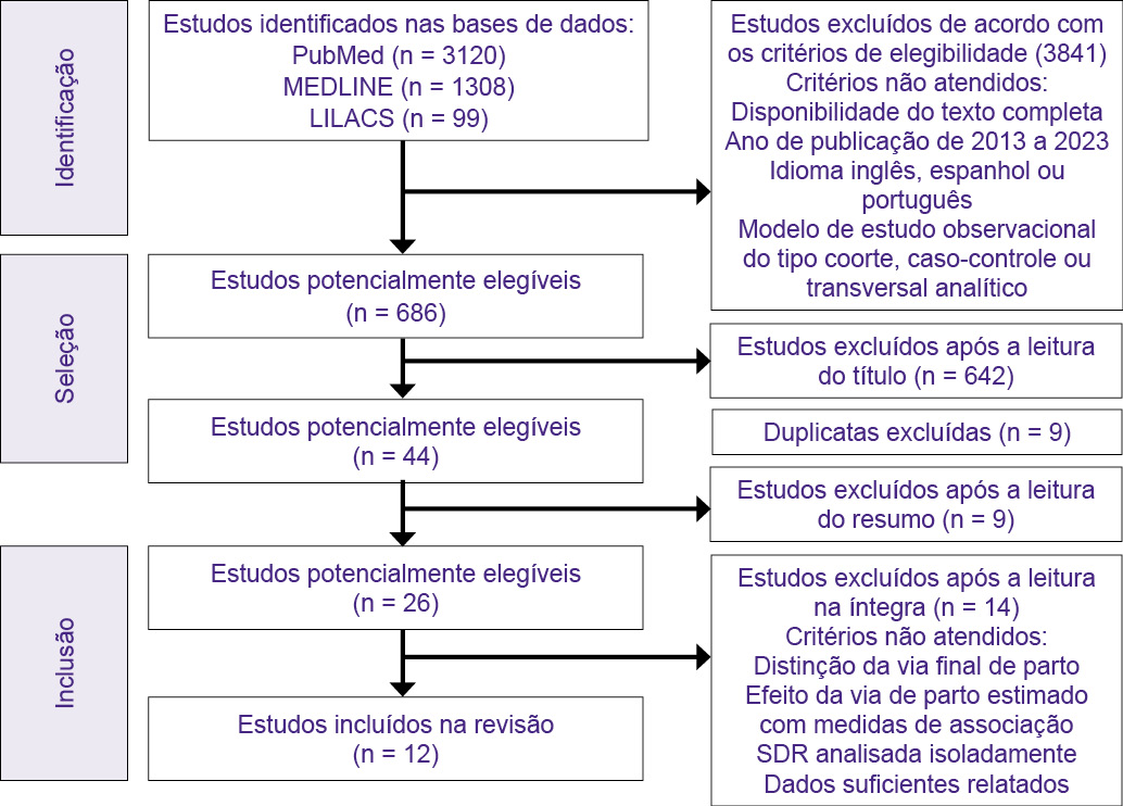 Os critérios de inclusão adotados consistiram nos seguintes: disponibilidade do texto completa; ano de publicação de 2013 a 2023; idioma inglês, espanhol ou português; modelo de estudo observacional do tipo coorte, caso-controle ou transversal analítico; uso de medidas de associação com intervalo de confiança para estimar o efeito da via de parto (cesariana versus vaginal) na ocorrência de SDR.