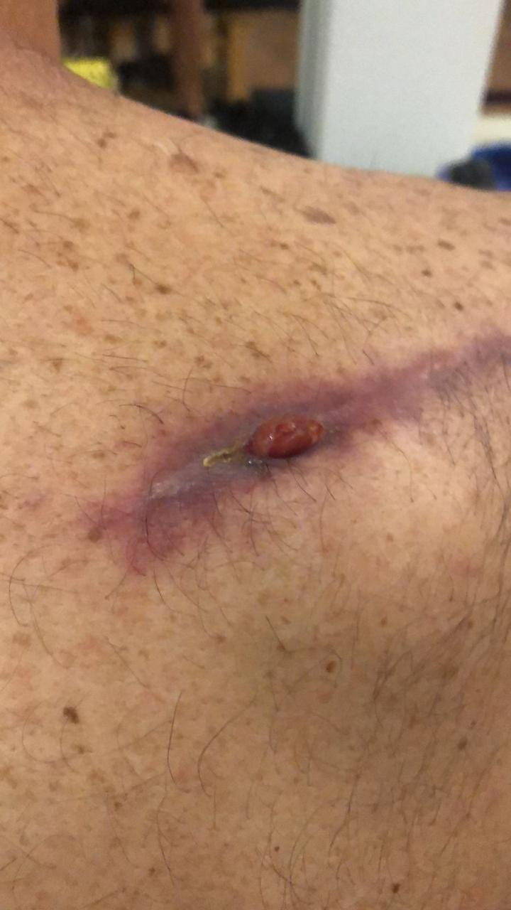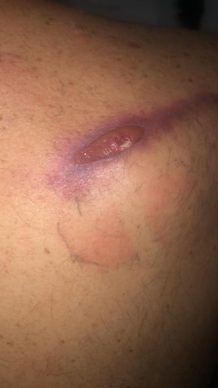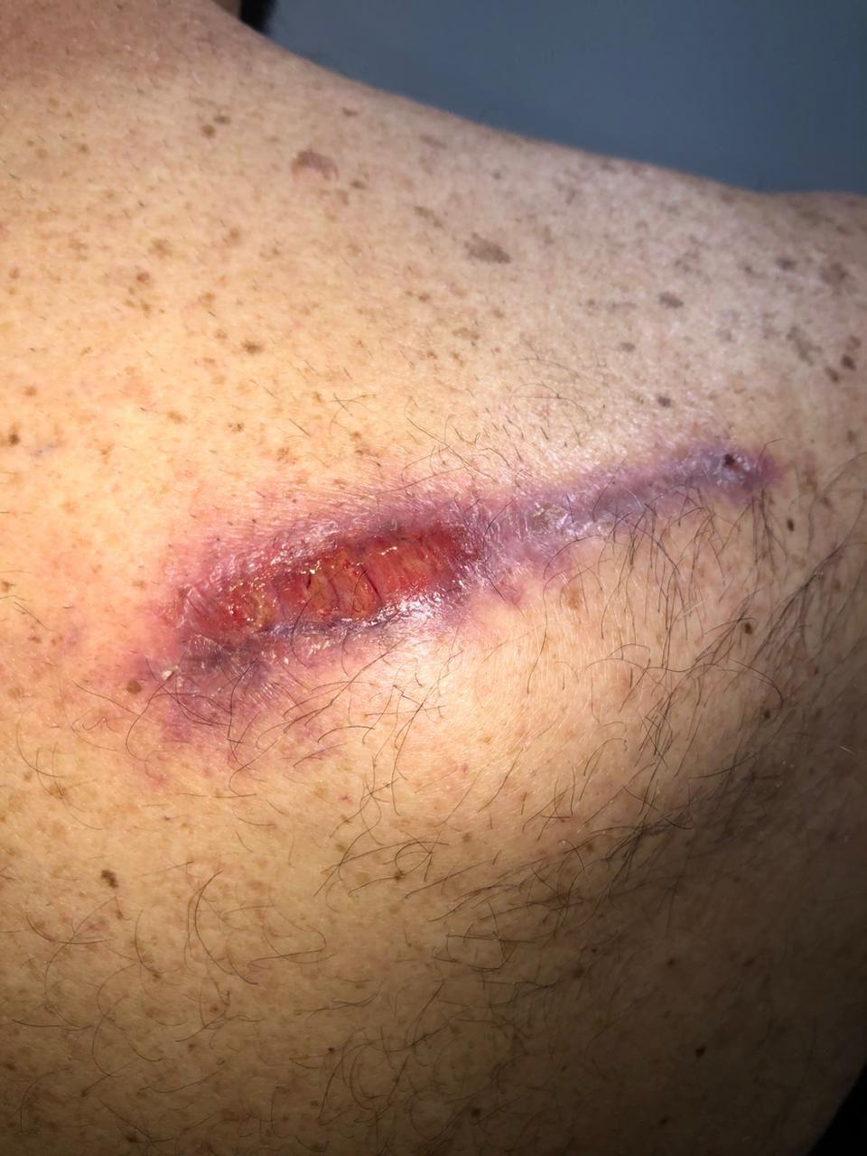 Figura 2 - Progressão da ferida com abertura superficial persistente e eritema ao redor. A área permaneceu sob manejo conservador. |
