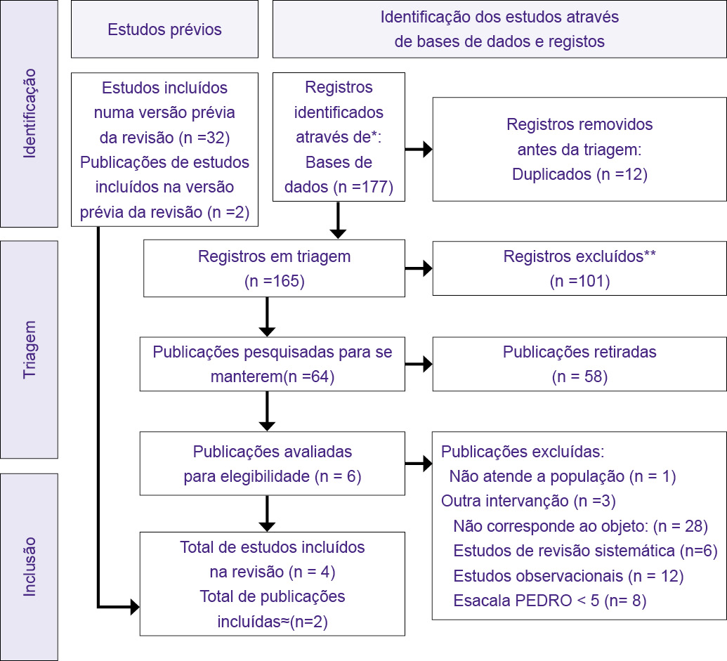 Um total de 177 artigos foram identificados nas bases de dados PubMed, Scielo, e BVS, dos quais, após a remoção dos duplicados (n=12), análise de título e resumo (n=101), e análise do texto completo (n= 58) seis foram incluídos na revisão por contemplarem os critérios de elegibilidade previamente descritos [8,9,10,11,12,13], sendo incluídos na presente revisão (Figura 1).