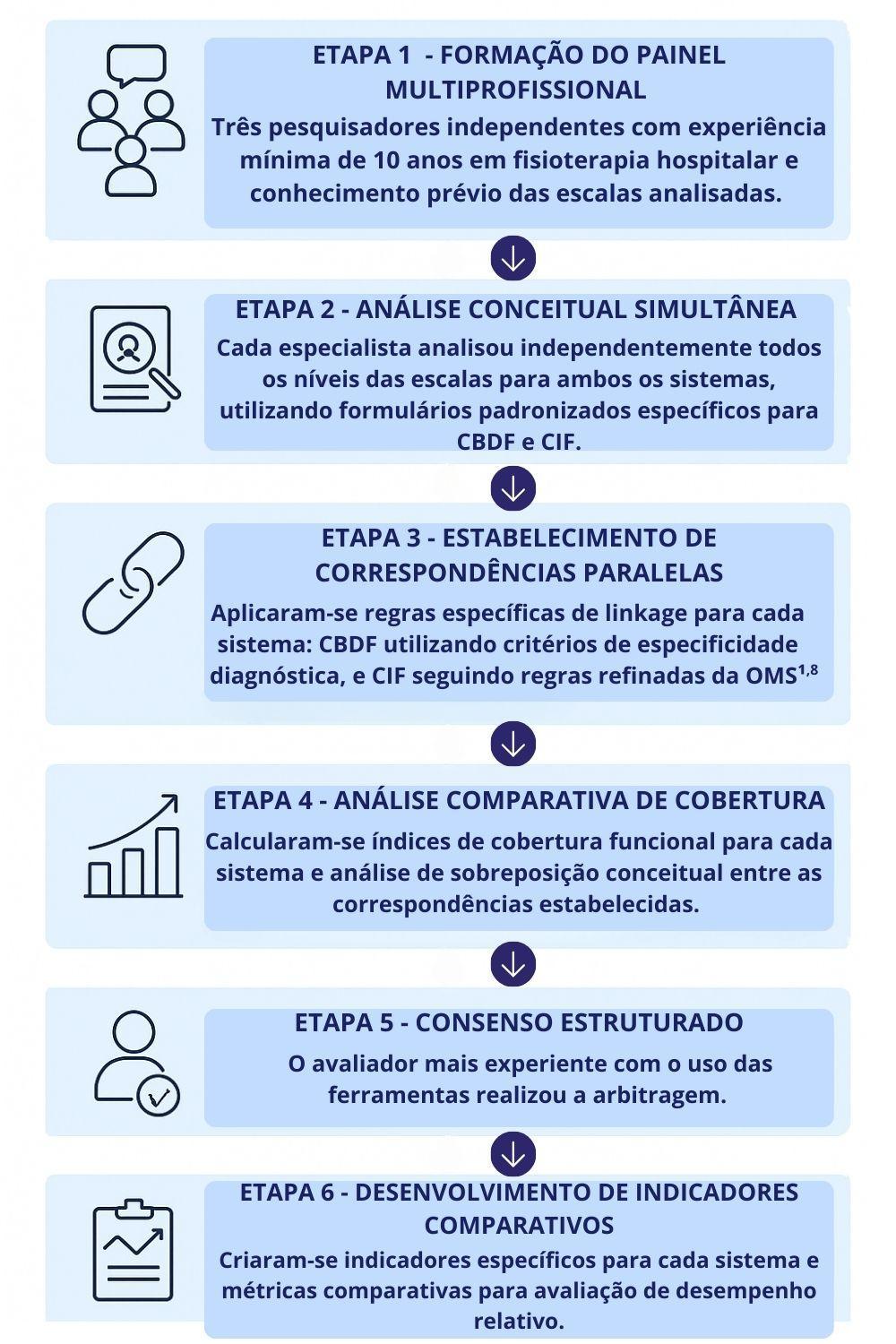 Estudo metodológico comparativo de desenvolvimento de linkage seguindo diretrizes estabelecidas para correspondências entre instrumentos de avaliação e sistemas de classificação funcional [9]. O processo seguiu metodologia sistemática de análise conceitual paralela e consenso de especialistas para ambos os sistemas.