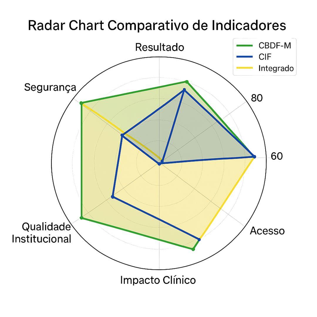 O modelo Integrado apresenta desempenho superior em todos os indicadores, com destaque para Segurança e Qualidade Institucional, nos quais atinge pontuações próximas ao valor máximo. O modelo CBDF-M demonstra desempenho elevado em Resultado e Acesso, porém apresenta menor pontuação em Qualidade Institucional. Já o modelo CIF evidencia bom desempenho em Acesso e Resultado, mas pontuações inferiores em Impacto Clínico e Segurança.
