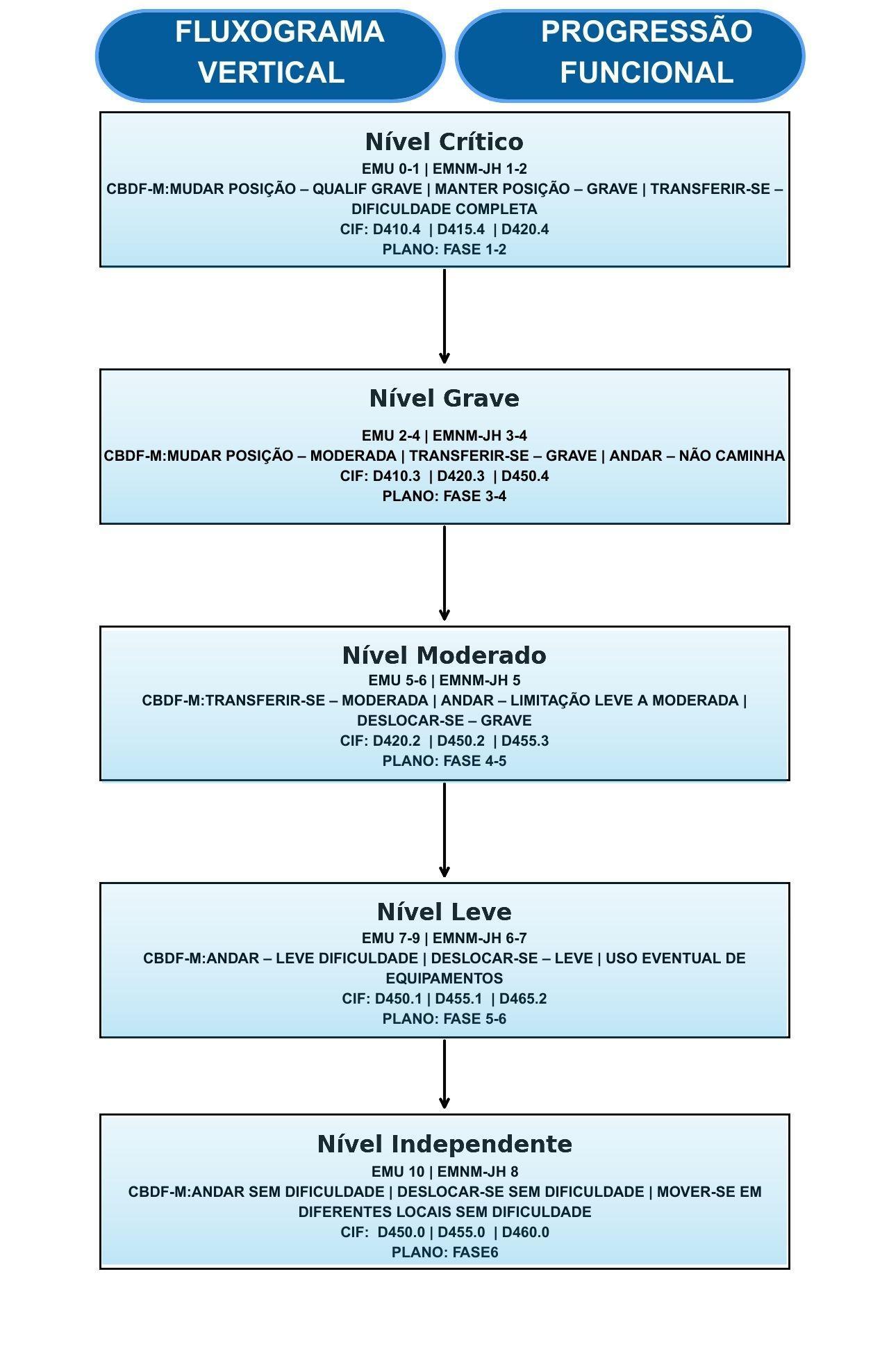 Complementarmente, observa-se que o cruzamento entre CBDF-M e CIF reforça a especificidade da progressão funcional, uma vez que descreve não apenas a intensidade do comprometimento, mas também a natureza da tarefa envolvida, tais como: mudar ou manter posição, realizar transferências, iniciar a marcha ou deslocar-se em diferentes ambientes.