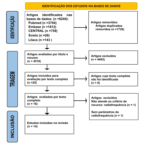 O fluxograma PRISMA da imagem 1, demonstra que os descritores utilizados resultaram em 6244 referências. Após exclusão de 1726, restaram 4518 para triagem de resumos e títulos. Dentre esses artigos 4493 foram excluídos por não atenderem os critérios de elegibilidade, restando apenas 25 artigos para leitura de texto completo, dos quais não foi possível o acesso ao texto completo de 9 artigos mesmo após solicitação aos autores por email e ResearchGate, assim, 14 preencheram os critérios de inclusão e foram submetidos à extração de dados.