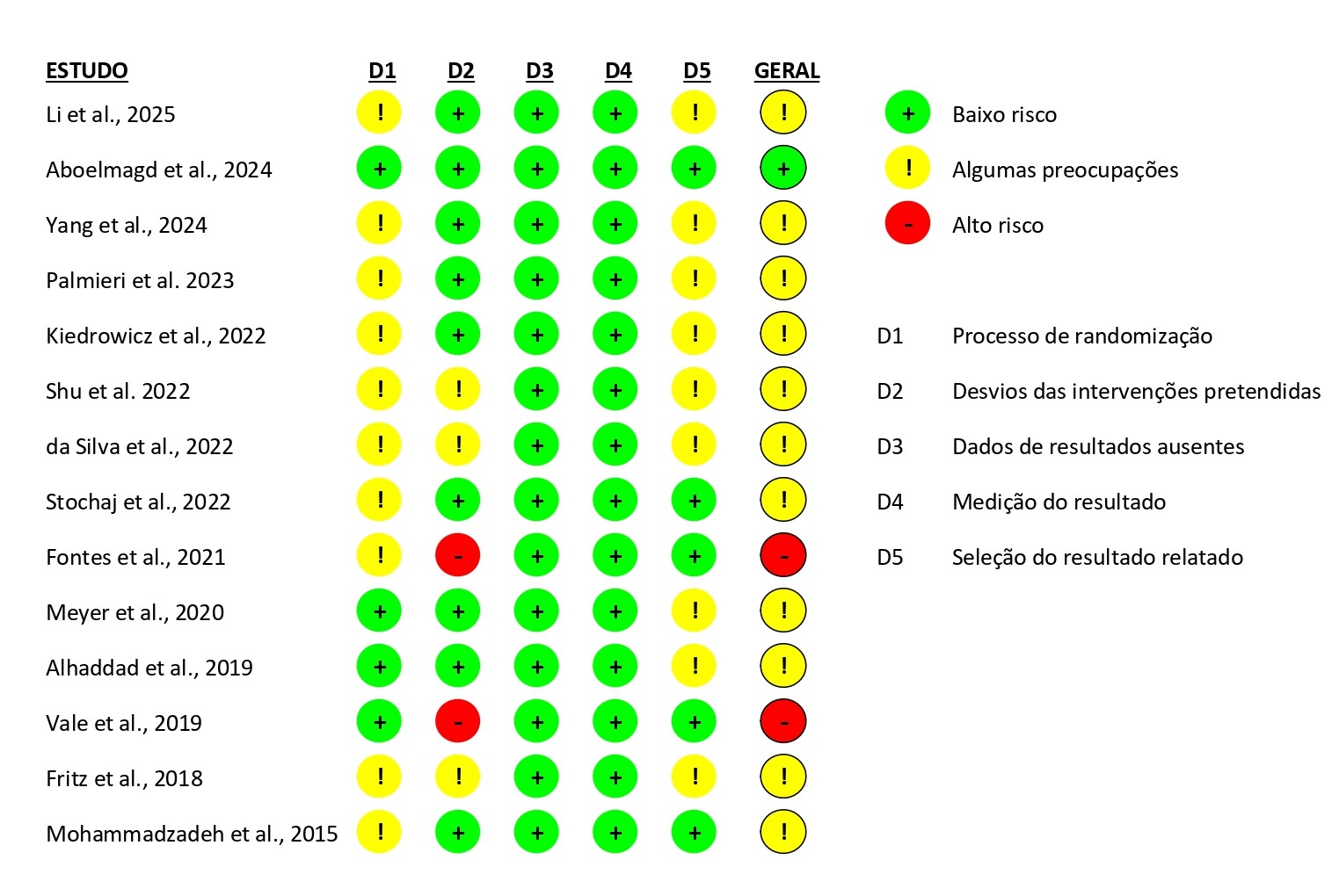 Através do Rob2, a análise do risco de viés nos estudos incluídos revela que, na maioria dos casos, o julgamento global foi classificado como “algumas preocupações”. Isso indica que, embora os estudos não apresentem um alto risco de viés, há aspectos metodológicos que podem afetar a confiabilidade dos resultados. Os domínios mais frequentemente problemáticos foram relacionados à randomização (D1) e à seleção de resultados reportados (D5), sugerindo que alguns estudos podem ter limitações na forma como os participantes foram alocados aos grupos, principalmente no método utilizado para randomização da amostra ou na transparência na divulgação de todos os resultados mensurados. Esse padrão de “algumas preocupações” evidencia a necessidade de interpretar os achados com cautela, reconhecendo que, embora os resultados sejam geralmente consistentes, pequenas fontes de viés ainda podem influenciar as conclusões. Portanto, a predominância desta classificação reforça a importância de manter um olhar crítico sobre a qualidade metodológica dos estudos, mesmo quando não se identifica um risco elevado de viés.