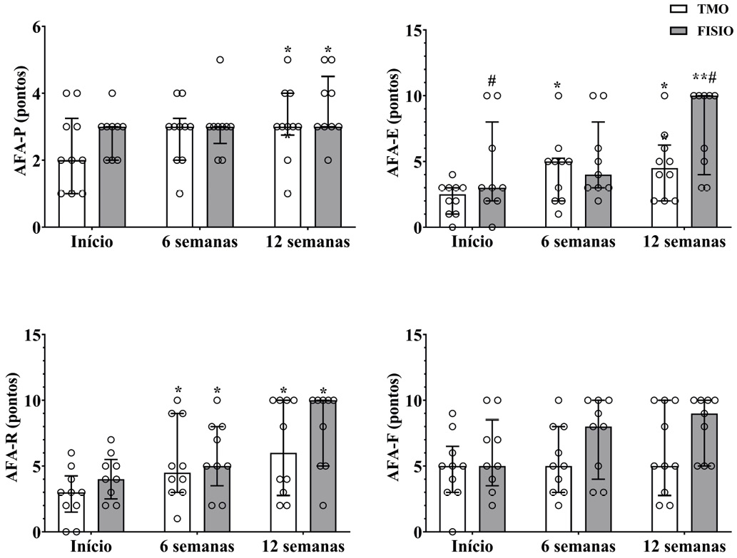 Figura 3 - Avaliação da força dos músculos do assoalho pélvico por meio da escala de avaliação funcional NEW PERFECT. * P < 0,05 quando comparado ao Início; ** P < 0,05 quando comparado ao Início e a 6 semanas; # P < 0,05 quando comparado ao grupo TMO; Tratamento Manipulativo Osteopático (TMO); Fisioterapia (FISIO); Círculos representam valores individuais. Barras são valores medianos e os desvios a amplitude interquartil (1º-3º quartil dos dados).