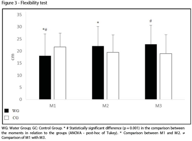 With regard to the increase in flexibility, it is believed that the combination of factors such as high water temperature, the thrust and the static stretching exercises of the posterior muscle chain, were responsible for the decrease in painful spasm, facilitating the gain in muscle elasticity and range of joint movement. It should be noted that eight weeks of intervention are sufficient for increased flexibility [21,22,23].