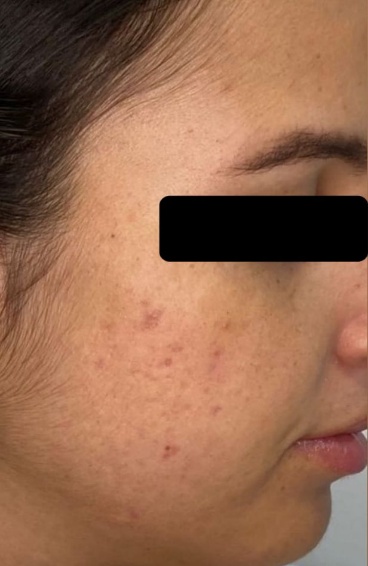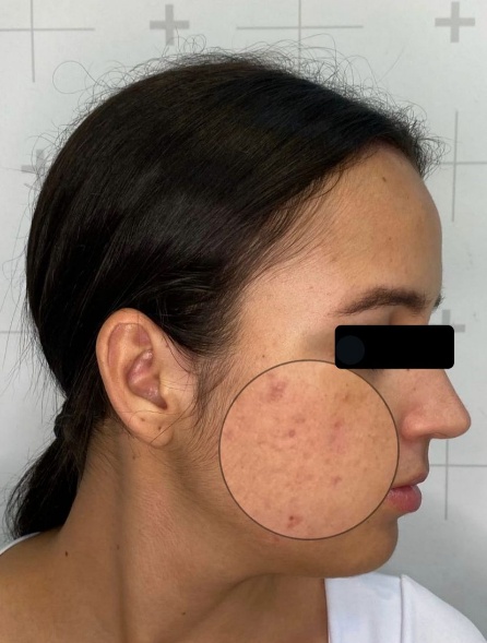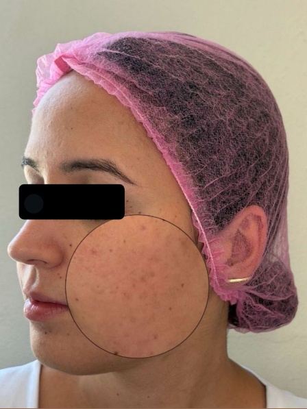 Uma mulher de 22 anos, solteira e estudante, diagnosticada com cicatrizes atróficas de acne na região malar bilateral (Figura 1 e 2), de grau moderado, de acordo com a classificação qualitativa de Goodman & Baron (2006) [14], foi selecionada para participar do estudo sobre microagulhamento associado a um dermoconstrutor com agentes naturais na regeneração de cicatrizes de acne.