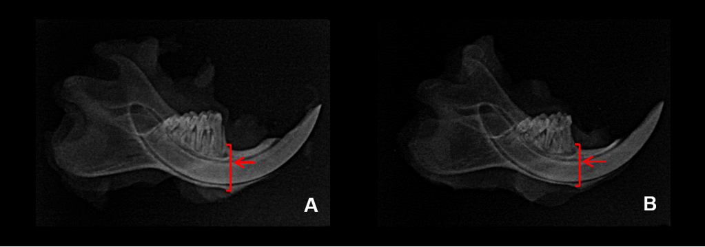 Fig. 3 - Radiographs of rat mandibles. A: CD group B: HFD group. Arrows indicate mandibular thickness