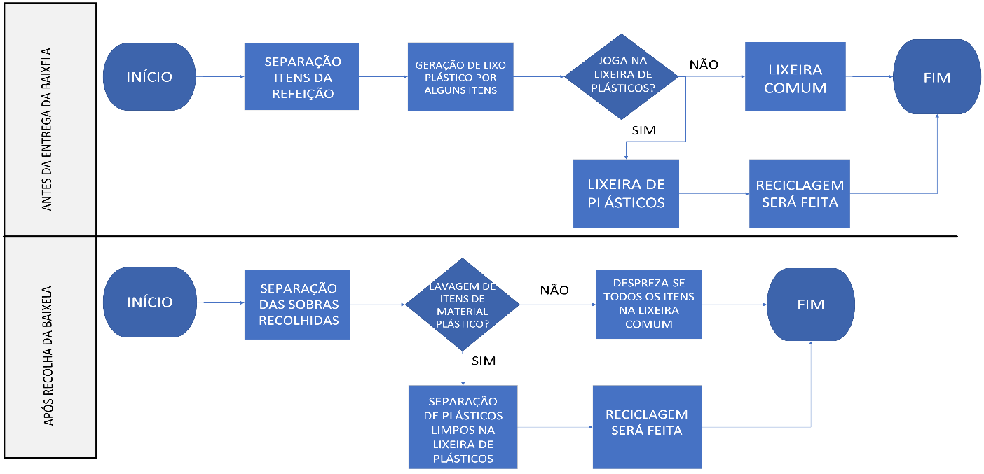 Através do SIPOC (Quadro 1) e fluxograma realizado (Figura 1), foi possível compreender algumas dificuldades e oportunidades do processo discutido. Como demonstrado no Quadro 1, durante o processo, o colaborador da copa tem dois momentos de decisão: ele pode, ou não, realizar a separação dos resíduos comum e plástico após a recolha de baixelas (etapa 2) e pode, ou não, realizar a lavagem dos itens plásticos separados para descarte correto (etapa 4). É importante ressaltar que a escolha só existe quando há uma lixeira para resíduos plásticos disponível dentro da copa, caso contrário, não há alternativa senão descartar esse material junto ao resíduo comum. Porém, quando há a opção, demonstra o quão essencial é que esse profissional entenda o seu papel e responsabilidade, bem como a importância da segregação correta desses resíduos para o fluxo correto do processo. Ressalta-se que existe uma política de mudança de posto de trabalho desse colaborador a cada 3 meses, sendo essencial que o fluxo se mantenha sempre que esse colaborador esteja em uma copa onde haja recipientes de acondicionamento de resíduos plásticos.