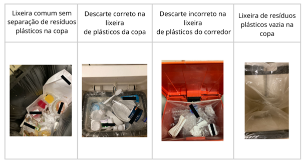 De acordo com a Figura 2, é possível visualizar imagens de recipientes de acondicionamento. Da esquerda para direita, as imagens mostram uma lixeira comum sem separação de resíduos plásticos, com o descarte sendo realizado conjuntamente com restos de alimentos, papéis e plásticos; o descarte correto de plásticos em sequência, com o material limpo e sem restos de alimentos; o descarte incorreto na lixeira de plásticos, uma vez que é possível visualizar além do próprio plástico, máscaras individuais; e, por fim, uma lixeira de plástico vazia. Para ilustrar os resultados, a Figura 2 representa as diferentes realidades encontradas nas lixeiras comum e para plásticos dentro das copas e, lixeira para plásticos nos corredores próximos às copas que não continham lixeiras internas.