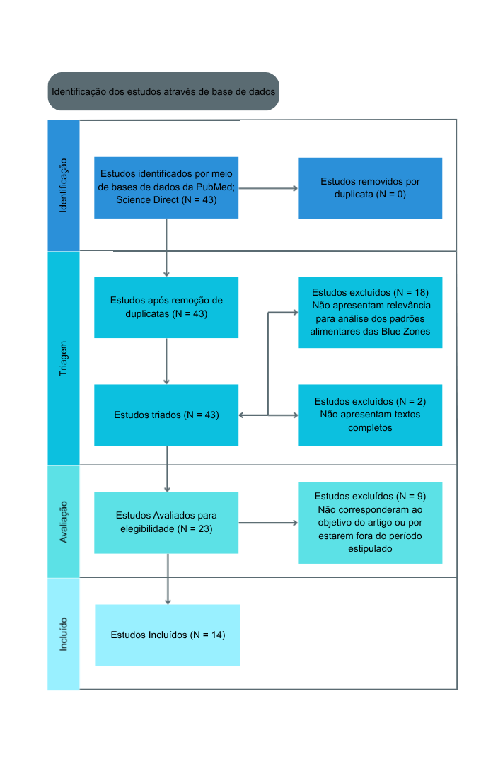 Ao final do processo, foram incluídos 14 artigos na revisão qualitativa, os quais forneceram evidências detalhadas sobre padrões alimentares e hábitos de vida associados à longevidade nas Blue Zones. O fluxograma do PRISMA (Figura 2) apresenta de forma detalhada todas as etapas do processo de seleção, destacando os critérios aplicados em cada fase e garantindo transparência e reprodutibilidade da pesquisa.
