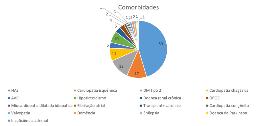 As comorbidades mais frequentes foram hipertensão arterial sistêmica, diabete, cardiopatia isquêmica e chagásica, como está demonstrado no Gráfico 1. Estavam em uso de 5 ou mais medicamentos 46 pacientes (41,8%).