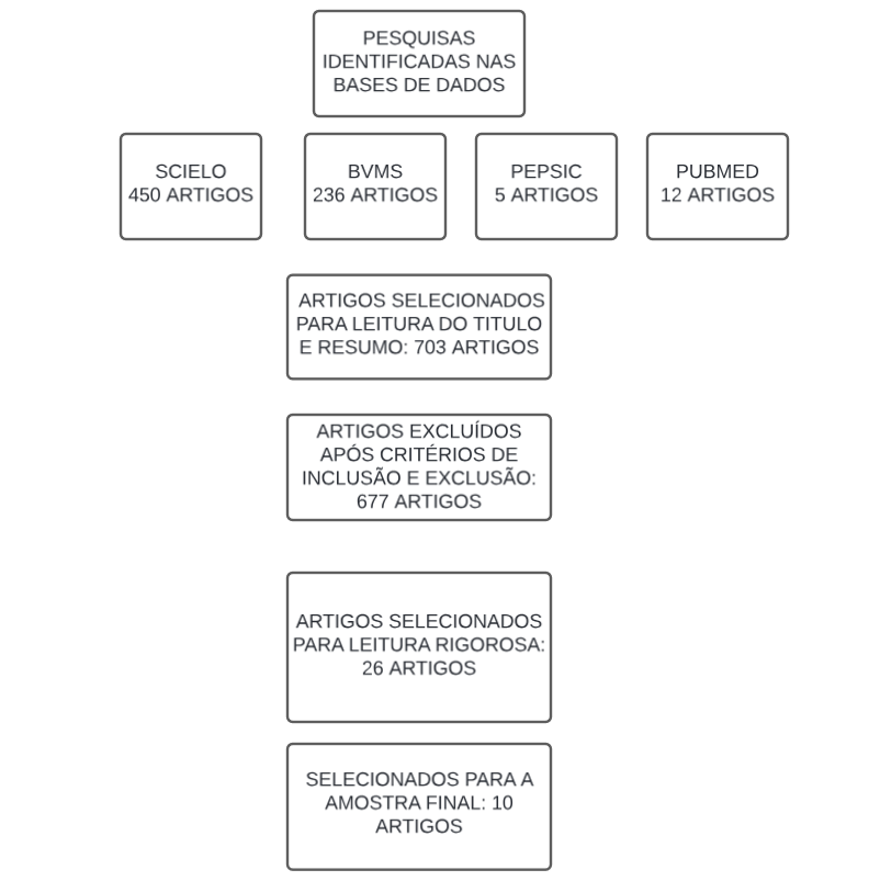 A amostra final foi composta por 10 artigos, com isso, elaborou-se um fluxograma PRISMA para compreender melhor as etapas até o resultado final.