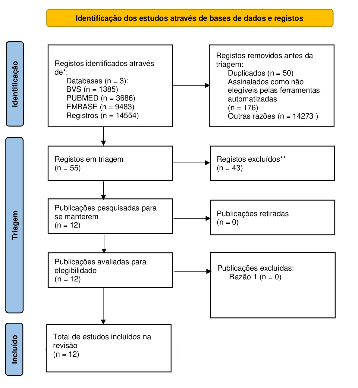 Após utilizar o critério de eliminação por títulos restaram 346 artigos. Ao eliminar os resultados que não foram elegíveis aos requisitos nos resumos, restaram 281 artigos. E após excluir artigos anteriores aos últimos 10 anos e duplicados, obteve-se 55 artigos. Utilizando o critério de leitura integral do texto e discussão com a orientação sobre discrepâncias, permaneceu na revisão o total de 12 artigos. O processo de busca e seleção encontra-se descrito no Fluxograma da Figura 1.