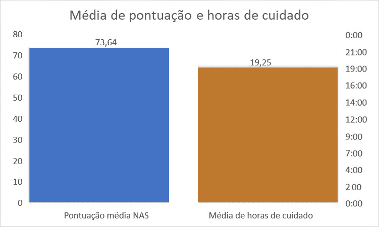 As horas de cuidado e a pontuação média do NAS são semelhantes quando comparadas a medições realizadas em diferentes períodos. A comparação entre o Período 1 (medições em três momentos) e o Período 2 (única avaliação diária) totalizou uma média de 17,8 horas e uma pontuação de 74,1 pontos no NAS, em consonância com as diretrizes da Resolução 543/2017 [10].