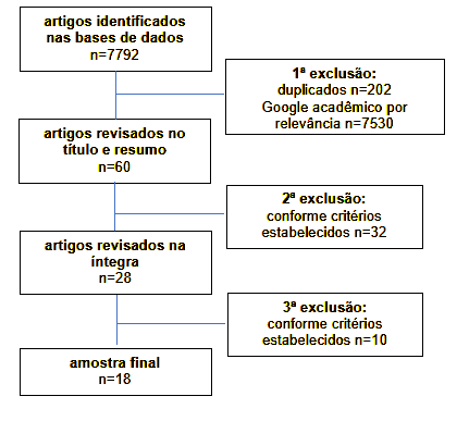 Foram identificadas 16 publicações na Medline, 15 na LILACS, 14 na BDENF, 10 no IBECD, 1 no SciELO, 106 no SCOPUS e 7630 no Google Acadêmico, totalizando 7792 registros. A amostra foi composta por 18 publicações (Figura 1).