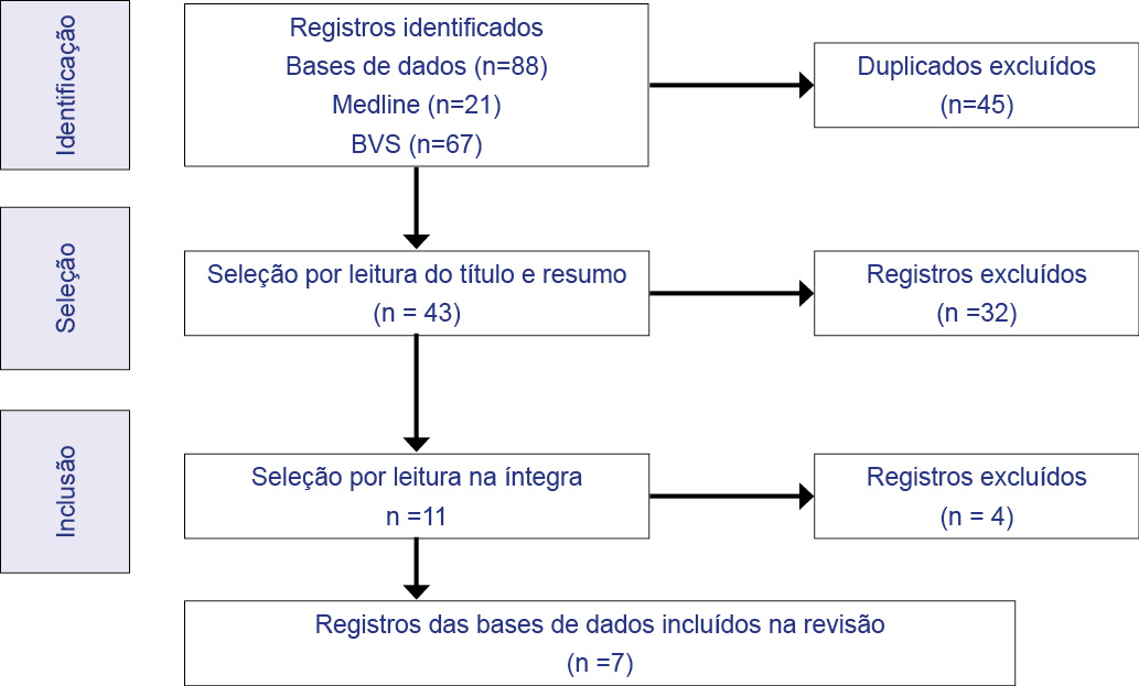 Identificaram-se 88 (oitenta e oito) registros sobre o tema e 43 foram lidos resumo e título. Posteriormente, 11 artigos foram lidos na íntegra. O detalhamento da seleção da amostra se encontra na figura 1.