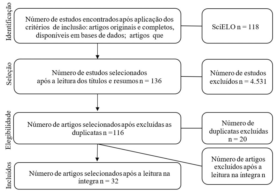 Foram examinados estudos realizados no intervalo de 2013 a 2023, abrangendo uma busca nas bases de dados, realizada entre novembro de 2022 a fevereiro de 2023, que identificou 4.667 artigos. Após a análise de títulos e resumos, foram selecionados 136 artigos, enquanto 4.531 foram excluídos. Em seguida, 20 duplicatas foram removidas, resultando em 116 artigos para leitura na íntegra. Após a leitura, 84 artigos foram excluídos, culminando em uma amostra final de 32 artigos (Figura 1).