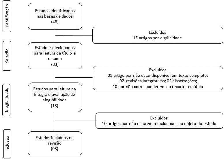 Na etapa de elegibilidade, foi realizada leitura na íntegra de 18 artigos, sendo excluídos 10 por não responderem ao objeto de estudo. Deste modo, oito publicações compuseram esta revisão integrativa. O fluxograma do processo de seleção dos estudos encontra-se apresentado na Figura 1, e a distribuição das publicações conforme identificação, autores/ano, base de dados/periódico, tipo de estudo/país, podem ser verificadas no Quadro 1.