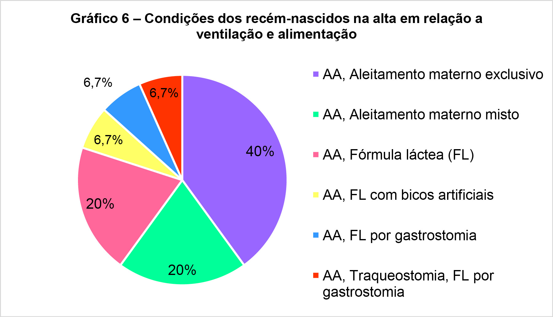 Acerca do tipo de ventilação e nutrição dos RNs no momento da alta, 100% (n=15) da amostra ventilava espontaneamente em ar ambiente (AA) e 87% (n=13) se alimentavam por via oral. 40% (n=6) em aleitamento materno exclusivo (AME), relatado seio materno livre demanda (SMLD). 20% (n=3) em aleitamento materno misto (AMM), que é quando o RN ainda está em aleitamento materno, mas também recebe fórmula láctea (FL). 20% (n=3), ingerindo FL sem utilização de bicos artificiais. 6,7% (n=1) ingerindo FL através de bico artificial. 6,7% (n=1) em AA, recebendo FL administrada pela gastrostomia (GTT) e 6,7% (n=1) possuindo traqueostomia (TQT) e recebendo FL através de GTT.