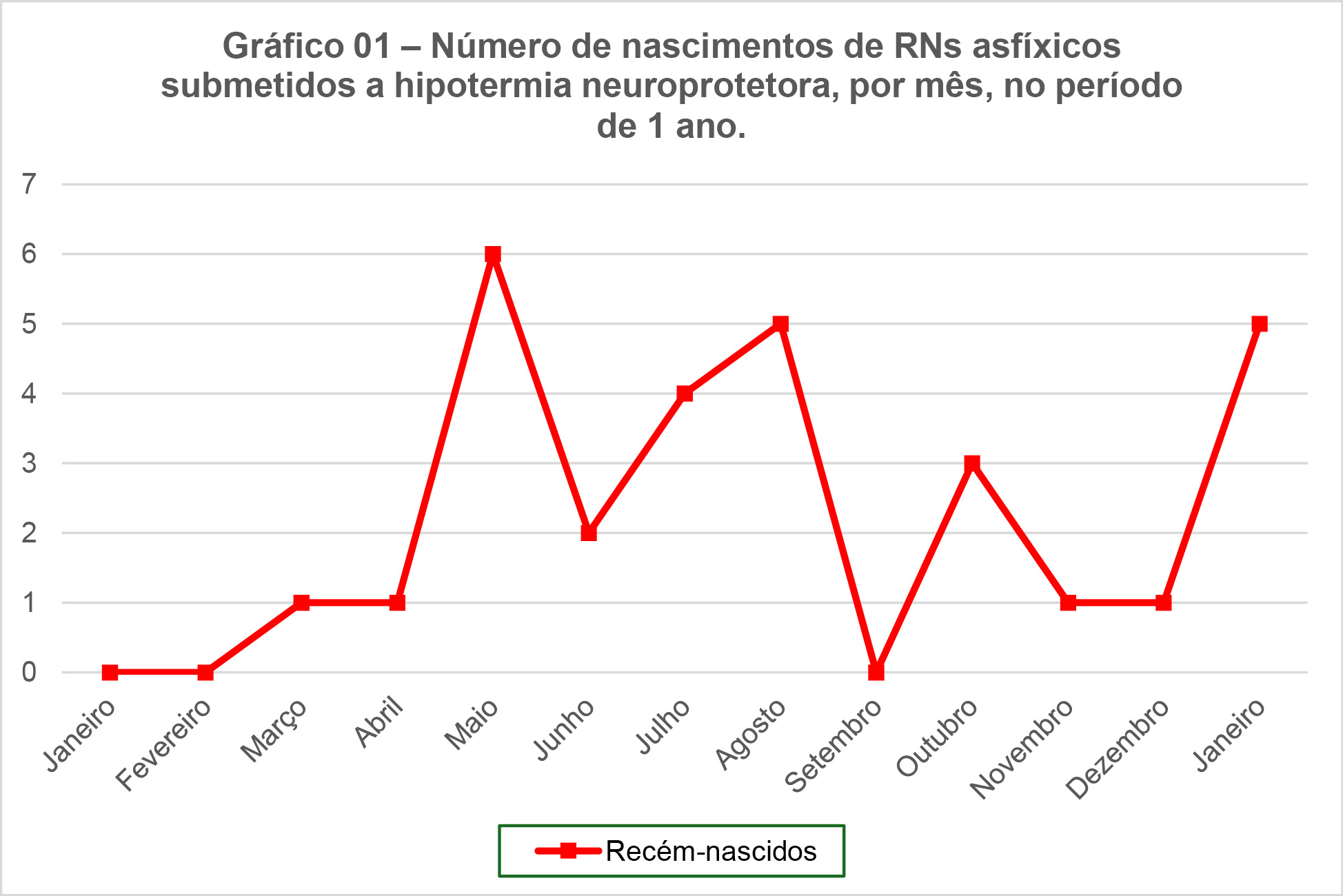 No período do estudo, foram encontrados 29 RNs com APN que foram submetidos a HT. Com maior ocorrência nos meses de maio (20,7%), janeiro de 2023 (17,2%), agosto (17,2%) e julho (13,9%).