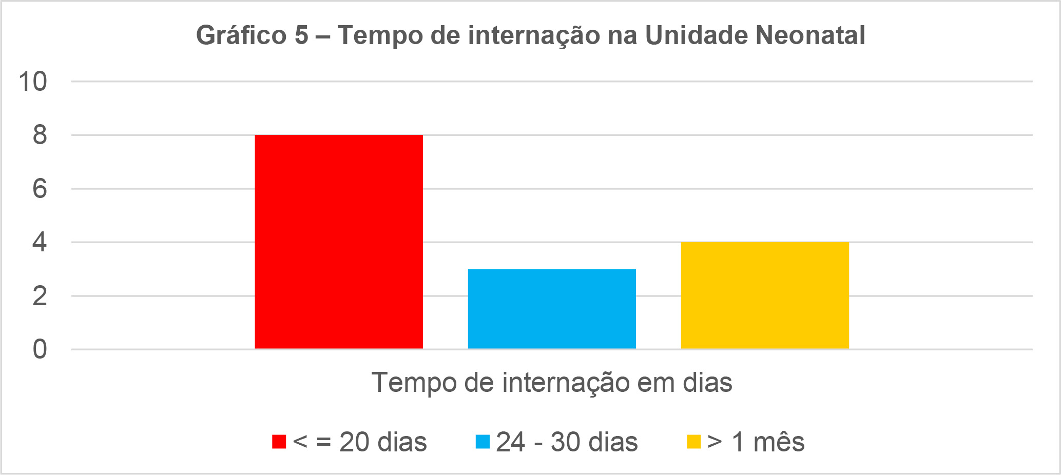 A respeito do tempo de internação na Unidade Neonatal (UTIN e UCINCo), 73% (n=11) dos RNs tiveram alta antes de 30 dias de internação. 53,3% (n=8) com 20 dias ou menos de internação, valor mínimo de 15 dias. 20% (n=3) de 24 a 30 dias. 26,6% (n=4) tiveram o tempo de internação superior a 1 mês, 6,7% (n=1) com 35 dias, 6,7% (n=1) 54 dias, 6,7% (n=1) 4 meses e 1 dia e 6,7% (n=1) 5 meses. A mediana do tempo de internação é de 20 dias.